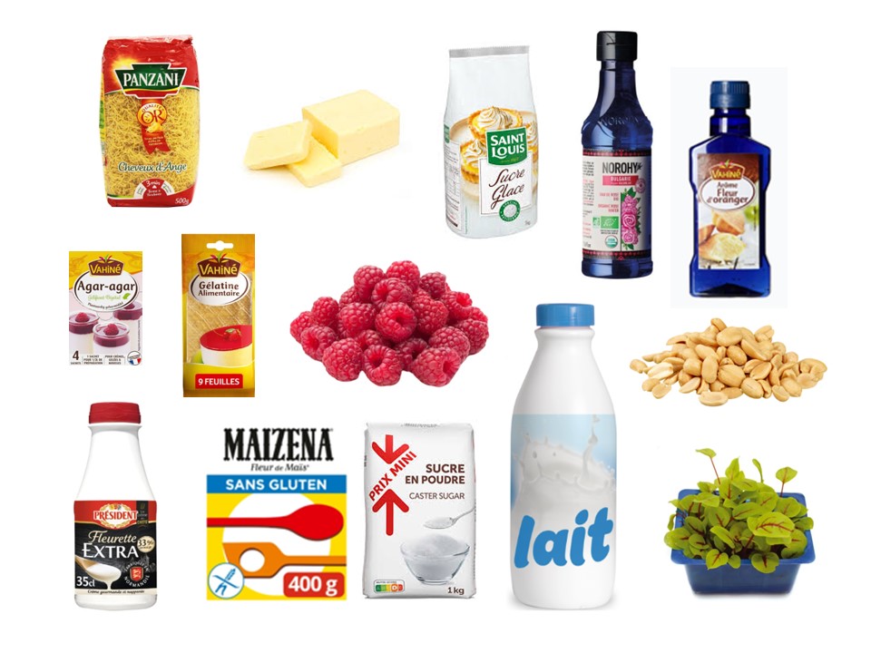 Faire chauffer l’eau de rose avec 250 g jus de framboises à 50° puis ajouter le mélange sucre et agar-agar.
