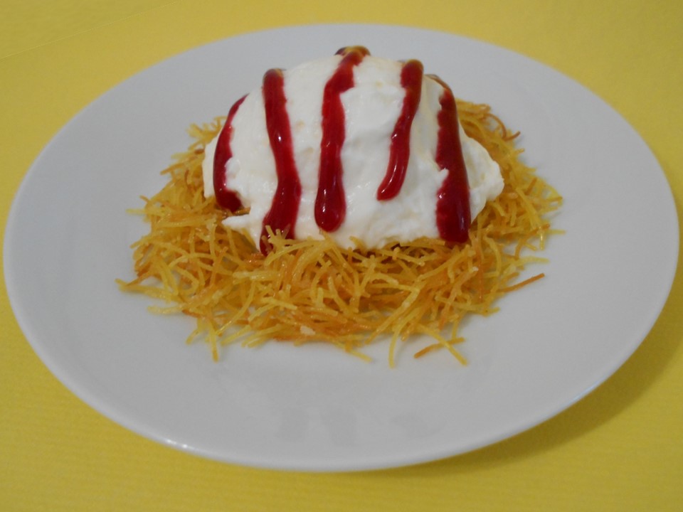 Répartir les cheveux d’ange croquants au fond de chacune des assiettes.