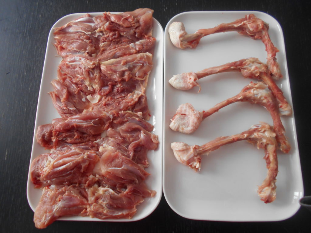 Découper la chair en 4 morceaux de taille équivalente (2 par pilon et 2 par haut de cuisse).